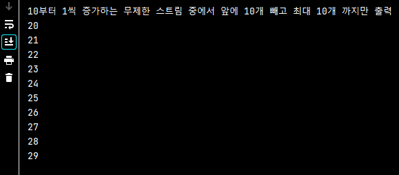 5) 10부터 1씩 증가하는 무제한 스트림 중에서 앞에 10개 빼고 최대 10개 까지만 출력