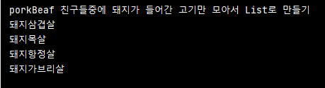 System.out.println("\nporkBeaf 친구들중에 돼지가 들어간 고기만 모아서 List로 만들기");