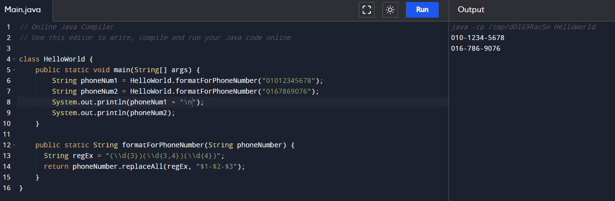 return phoneNumber.replaceAll(regEx, "$1-$2-$3");