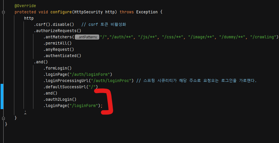 표시한 부분추가한다. oauth2로그인을위해 /loginForm을 등록
