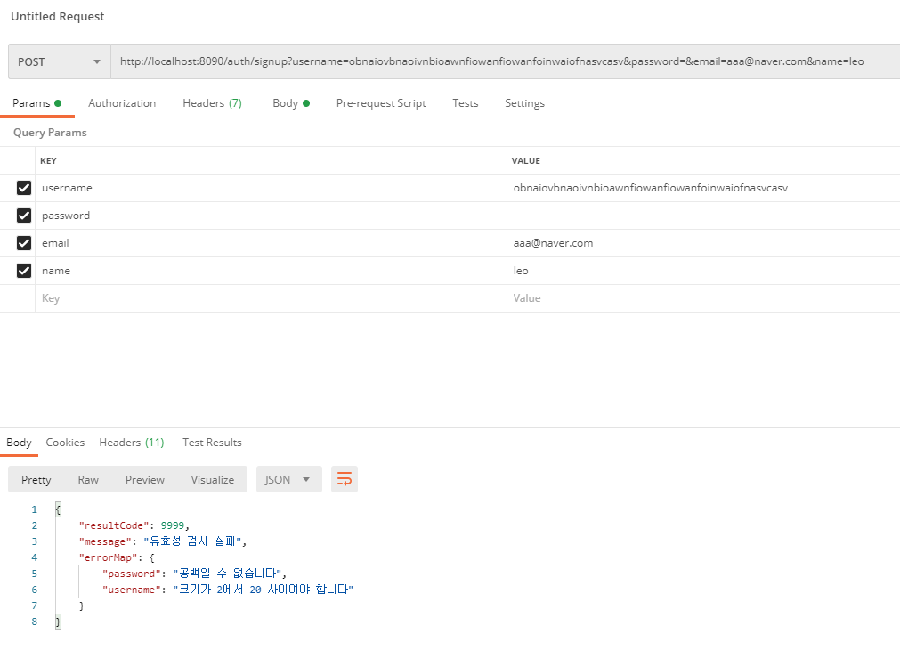 회원가입 요청을 받으면 파라미터를 @Valid로 받아 Custom으로만든 Exception 메세지를 보여주도록 처리했다.