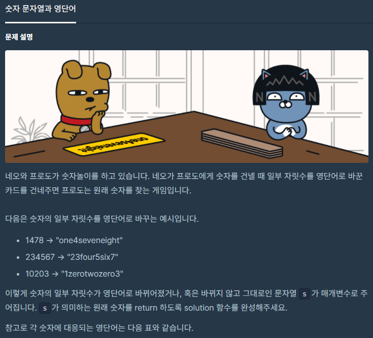 네오와 프로도가 숫자놀이를 하고 있습니다. 네오가 프로도에게 숫자를 건넬 때 일부 자릿수를 영단어로 바꾼 카드를 건네주면 프로도는 원래 숫자를 찾는 게임입니다. 다음은 숫자의 일부 자