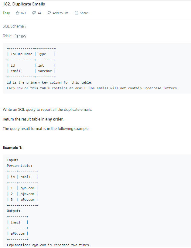 [SQL] LeetCode SQL 182. Duplicate Emails 본문