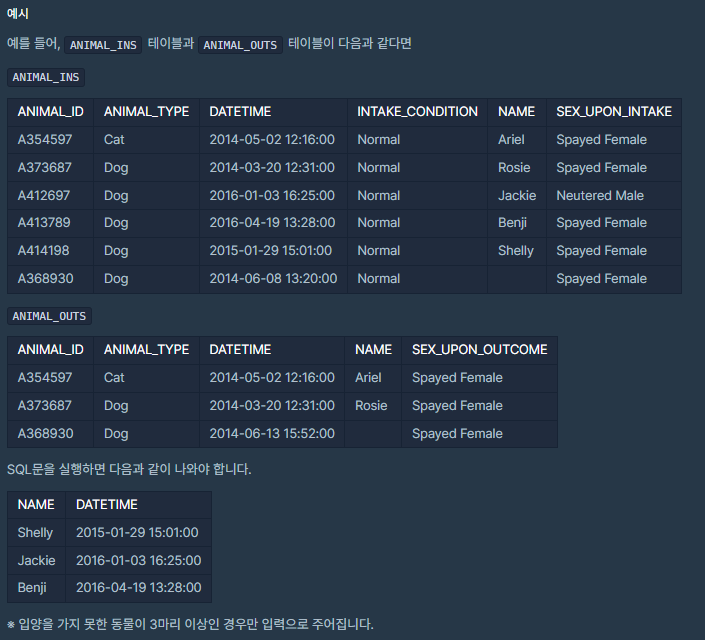 [SQL] 프로그래머스 오랜 기간 보호한 동물(1) 본문