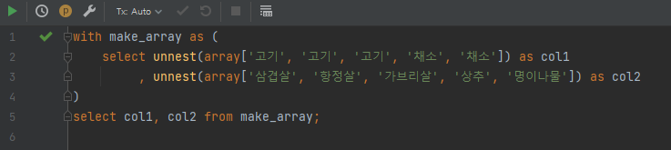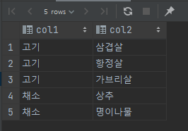 , unnest(array['삼겹살', '항정살', '가브리살', '상추', '명이나물']) as col2
