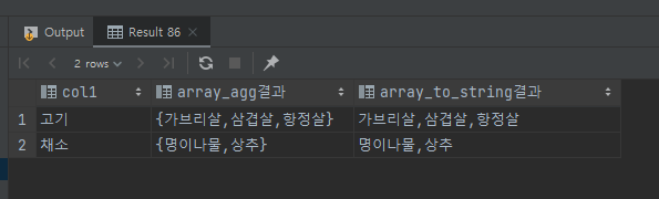 , array_to_string(array_agg(x.col2),',') as array_to_string결과