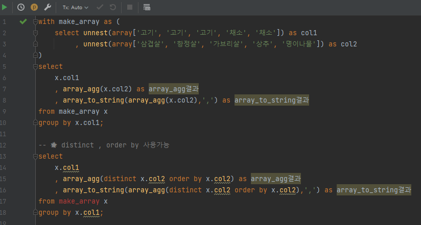 , array_to_string(array_agg(distinct x.col2 order by x.col2),',') as array_to_string결과