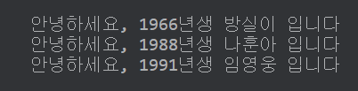 println("안녕하세요, ${this.birthYear}년생 ${this.name} 입니다")